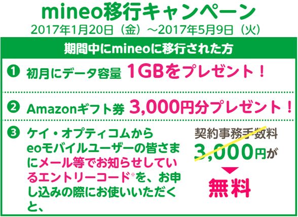 おとくですね。 1月20日~5月9日の期間にmineoへ移行すると、Amazonギフト券3000円分、利用初月分のデータ容量1GBプレゼント、契約事務手数料3000が無料となる